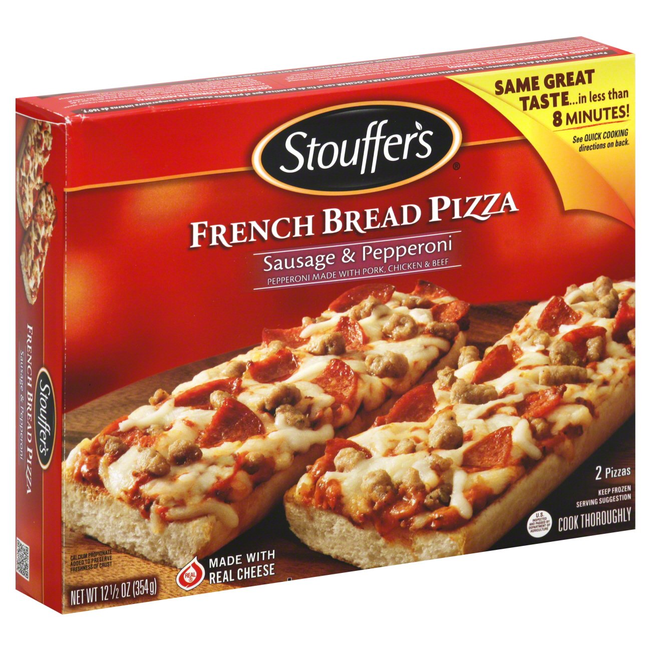 Explore delicious frozen dishes with stouffer s frozen meals. See package for complete instructions. Stouffer s deluxe french bread pizza is freshly made french bread topped with sausage pepperoni mushrooms red and green peppers and onions. Easy pan pizza foolproof crust healthier low fat pan pizza.
